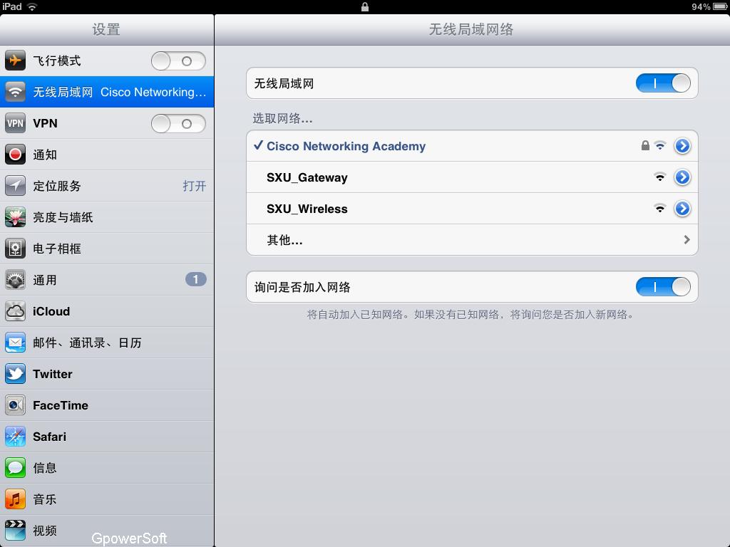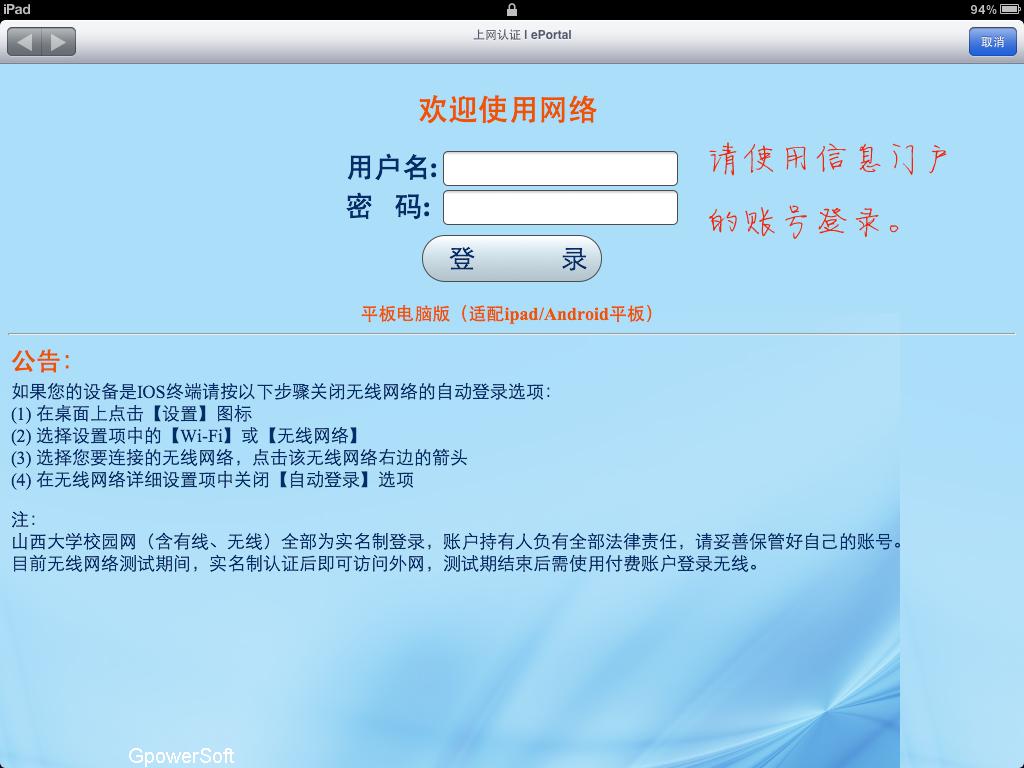 在文科楼、理科楼等可以访问无线校园网的环境中,提供两个名称(SSID)的无线信号:SXU_Wireless,SXU_Gateway。 无线信号 SXU_Wireless 可以使用新版信息门户的账号登录,访问校园网资源。(目前测试期间可以访问互联网) 无线信号 SXU_Gateway 可以使用计费网关账户登录,访问互联网。 下面是以 iPad 为例的使用过程: 在 iPad 桌面点击“设置”: ![]() 点击“无线局域网”; ![]() 当扫描到无线信号之后,点击“SXU_Wireless ” ,当连接成功后,会在该无线信号名称(SSID)旁出现对勾; ![]() 关闭设置,点开 Safari 浏览器访问任何网址,例如Google,会自动弹出认证页面,使用信息门户账户登录: ![]() 如果为笔记本,请勿关闭该页面,使用完网络之后请断开连接。如果终端为智能手机等,该页面会自动消失,无需额外操作: ![]() 当认证通过之后,左上角出现可用无线连接图标,即可访问互联网: ![]() |