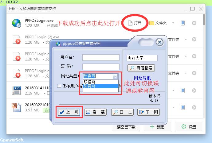 4、如果使用pppoe上网,网慢时建议把网址类型切换解决(教育网/联通网),关闭计算机时切记点击下网,否则将导致账号下次登录时出现异常。