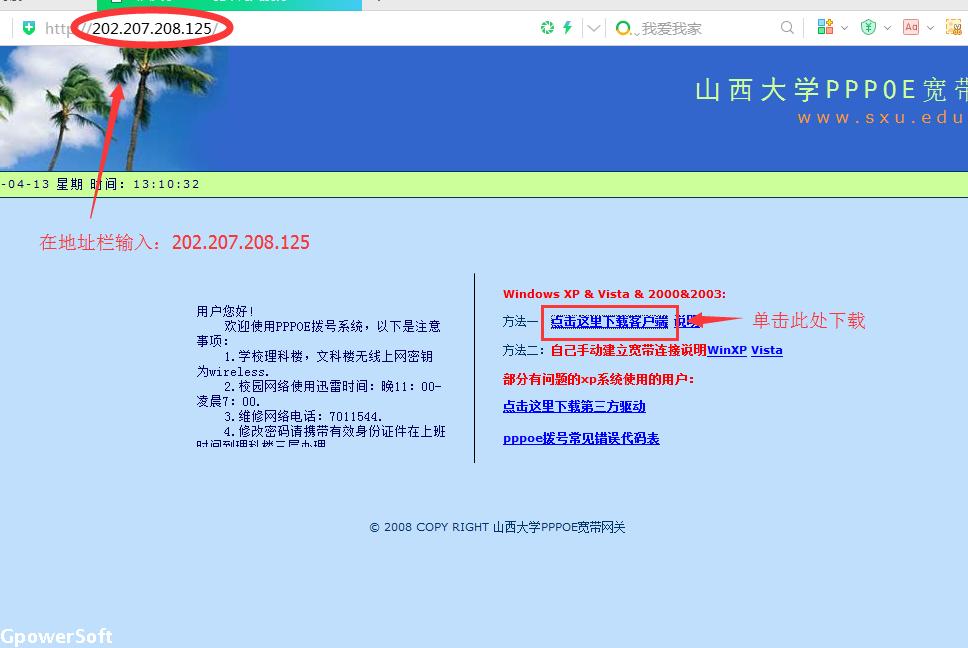 1、在浏览器地址栏输入网址或直接点击网址:202.207.208.125,进入此页后点击方法一:点击这里下载客户端