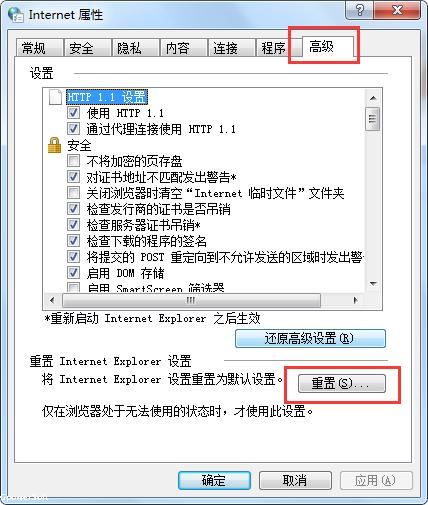 2、选择“高级”选项后,点击“重置”