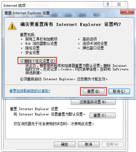 3、弹出如下窗口后选择“删除个性化设置”,点击“重置”选项
